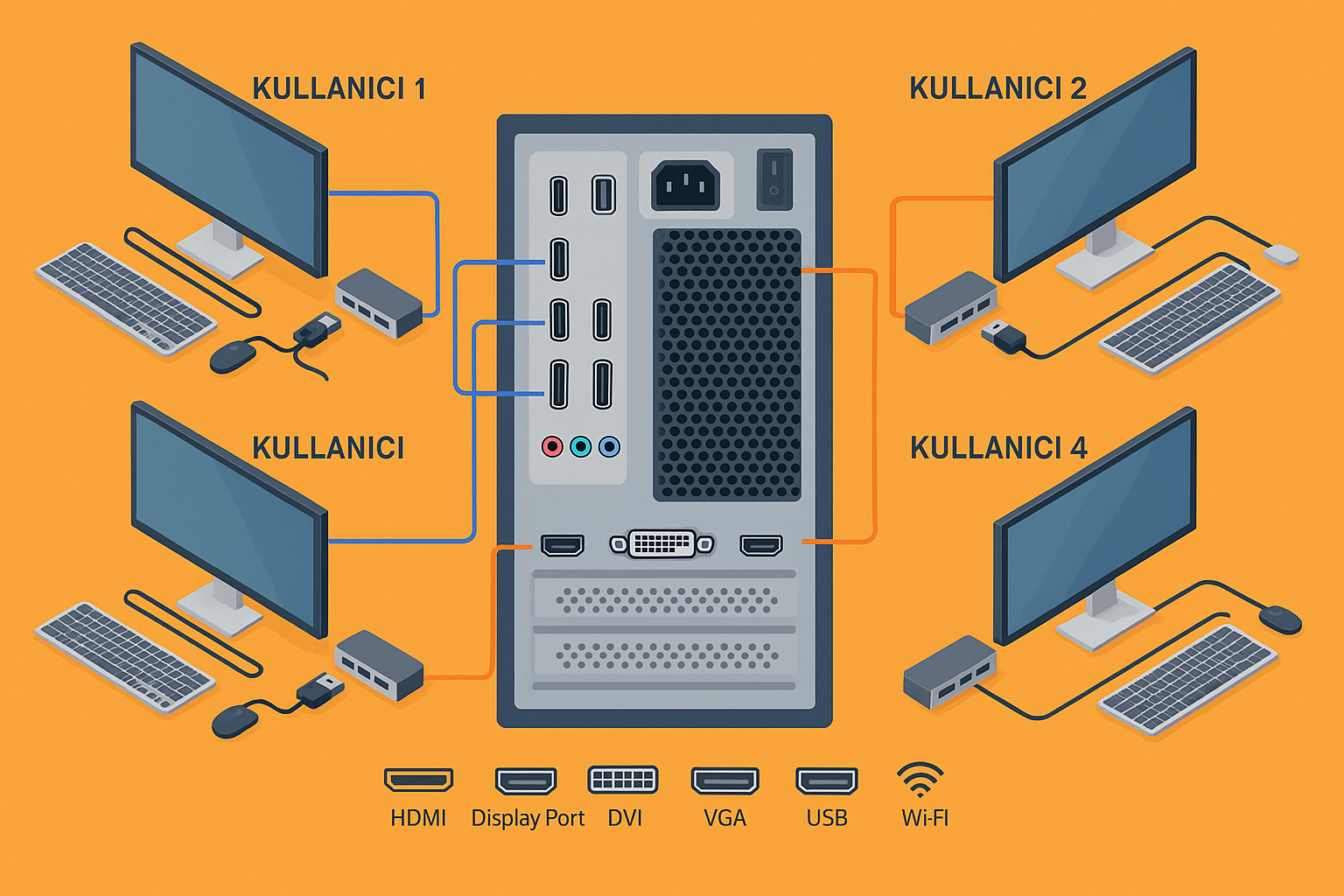Her kullanıcı için monitör, klavye, fare (ve gerekiyorsa kulaklık/mikrofon).