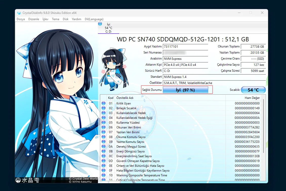 Daha detaylı kontrol için CrystalDiskInfo gibi güvenilir disk sağlık araçları kullanılabilir. Diskte Dikkat veya Kötü uyarısı görünüyorsa verileri yedeklemek ve diski değiştirmeyi düşünmek gerekir.
