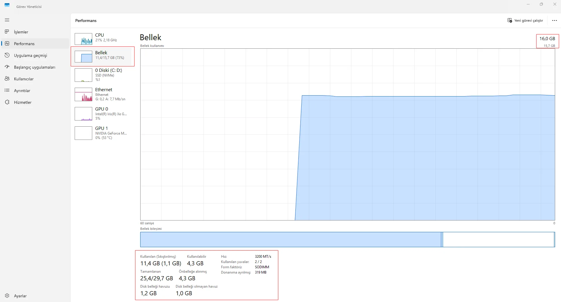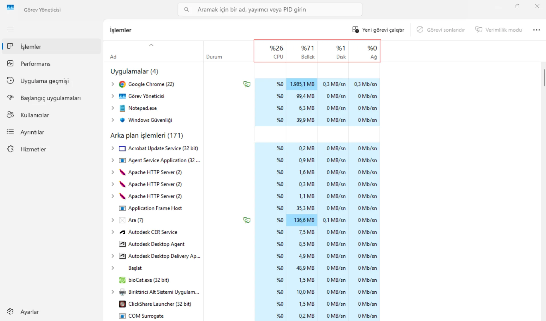 - Görev Yöneticisi’nden CPU, RAM ve disk kullanımına bakın.