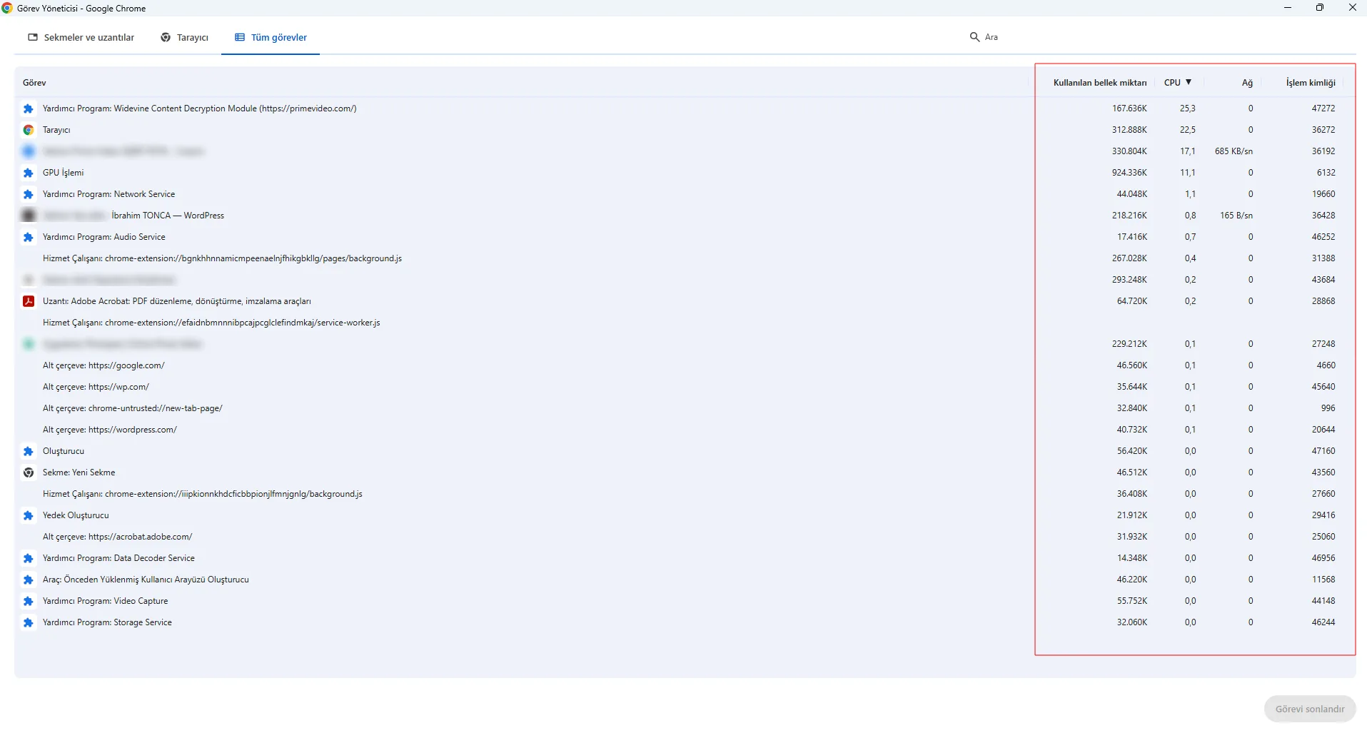 Klavyeden Ctrl + Shift + Esc tuşlarına basarak Görev Yöneticisi’ni açın. Ardından İşlemler sekmesine girin ve şu değerlere bakın: