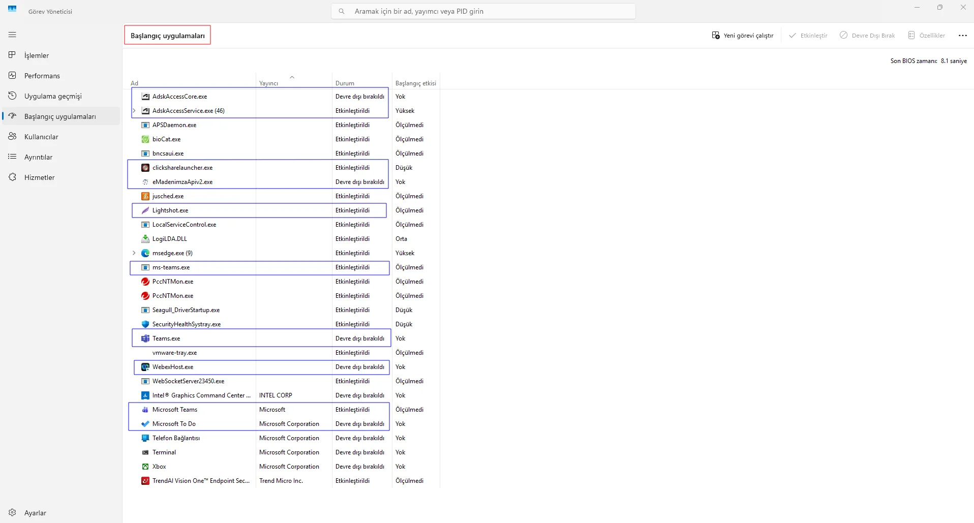 Bunu kontrol etmek için Görev Yöneticisi’ni açın ve Başlangıç uygulamaları bölümüne girin. Burada Başlangıç etkisi yüksek veya orta olan uygulamaları kontrol edebilirsiniz.