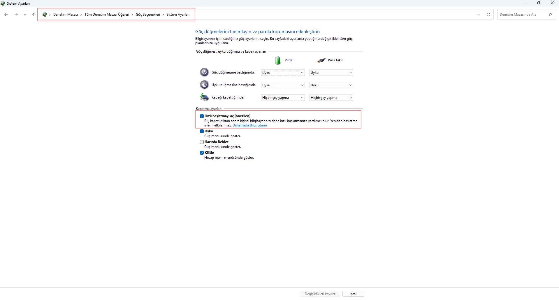 - Hızlı başlatmayı aç seçeneğinin işaretini kaldırın.
