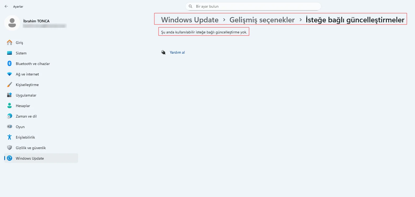 Ayarlar > Windows Update > Gelişmiş seçenekler > İsteğe bağlı güncelleştirmeler