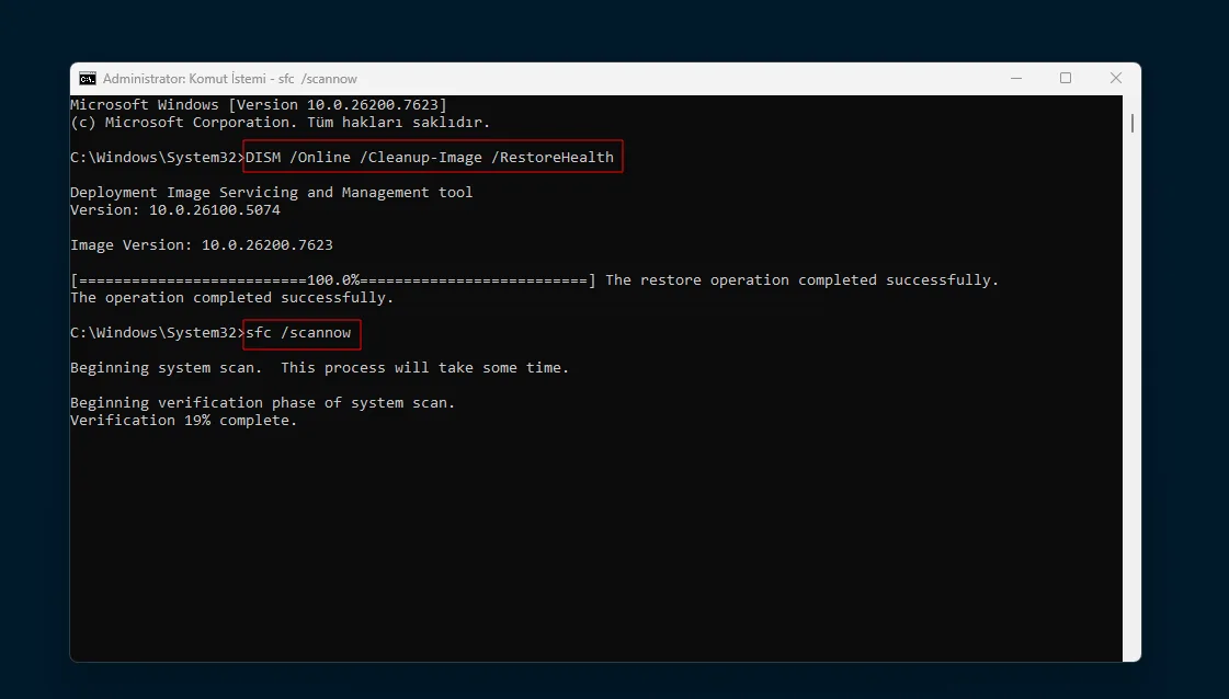 - Sistem dosyalarını önce DISM, ardından SFC komutlarıyla onarın.