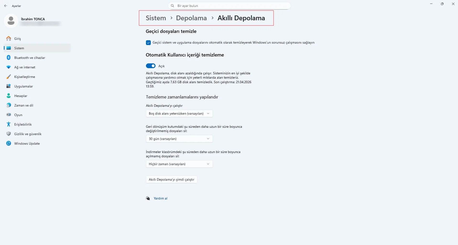 Windows’ta bulunan Akıllı Depolama, gereksiz dosyaları otomatik olarak temizlemeye yardımcı olur. Disk alanı sık sık dolan kullanıcılar için oldukça faydalı bir özelliktir.